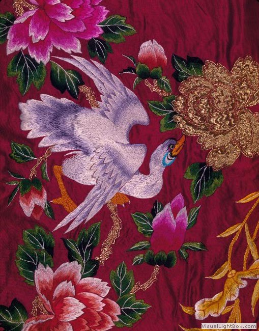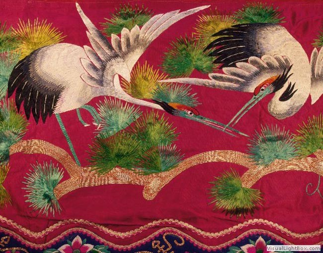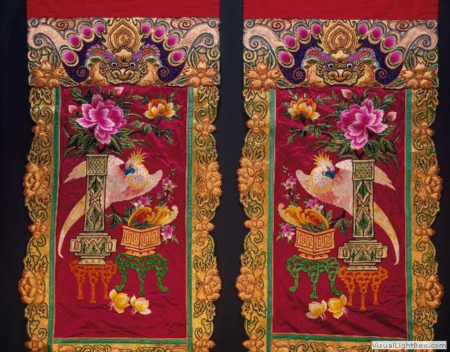 Whilst most temple embroideries were for general use, several pieces in the collection were for use at specific events. Funerals demanded the inclusion of blue. Others were to celebrate the birthday of elderly people and showing relatives and friends bringing their good wishes and gifts. Very special cloths were those used for the birthday of an old man, who had 5 generations of male descendents alive, including himself.