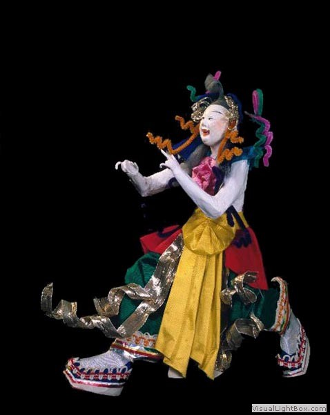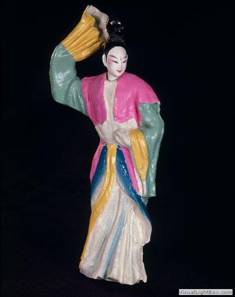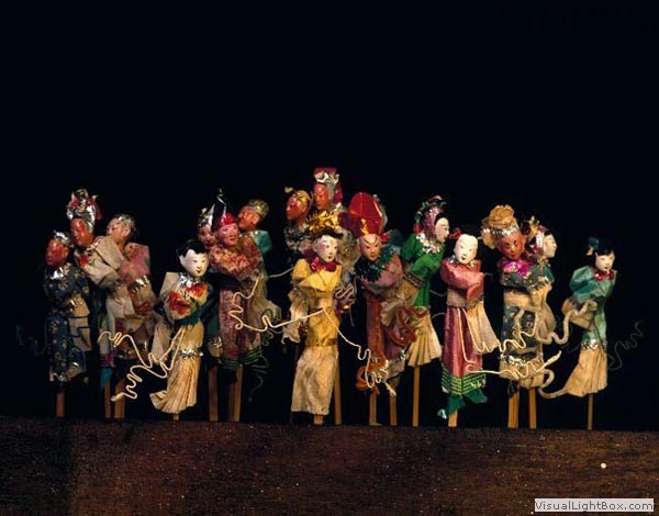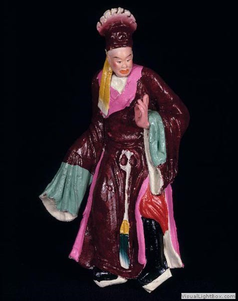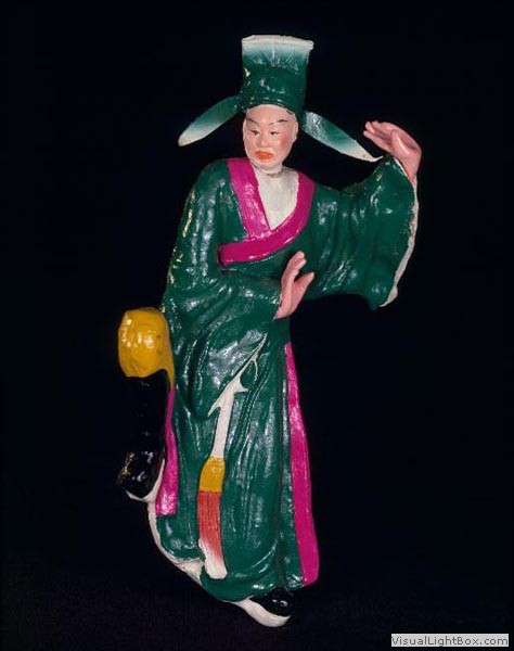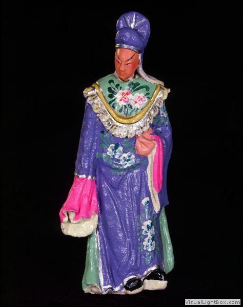 These small (c12cm) puppets were used in dioramas or as decorations on funerary and other occasions. They were placed on bamboo sticks for insertion in large joss sticks or other materials.