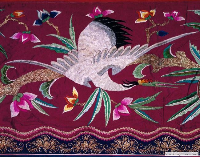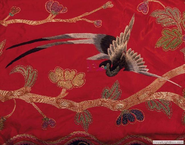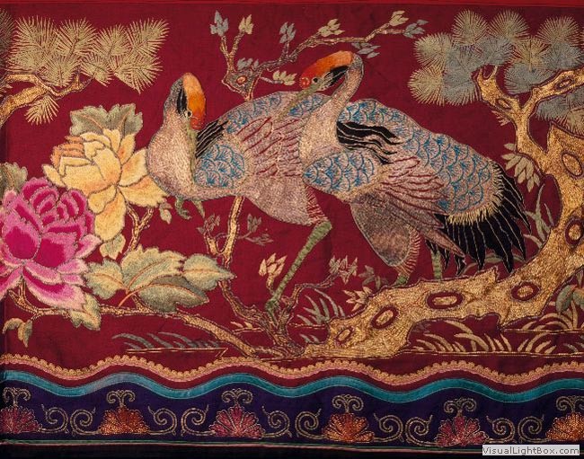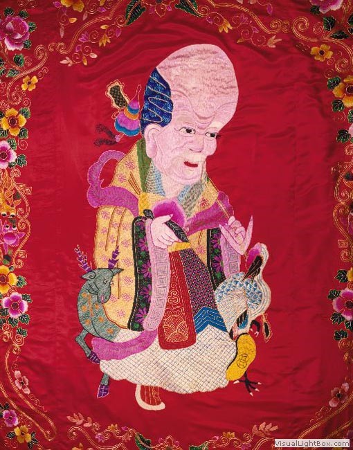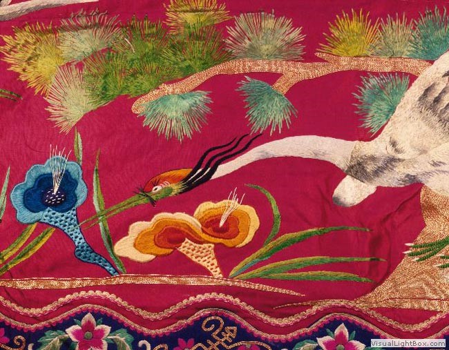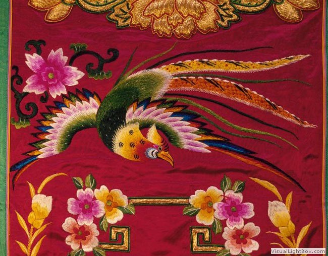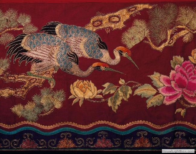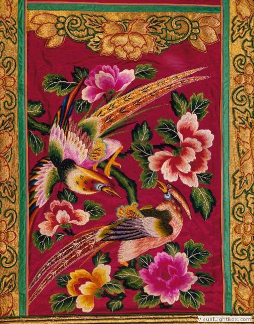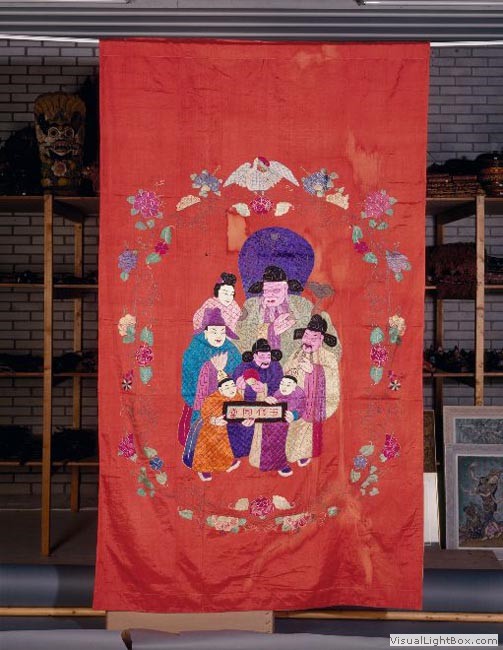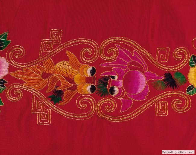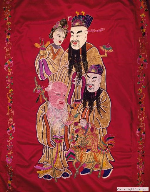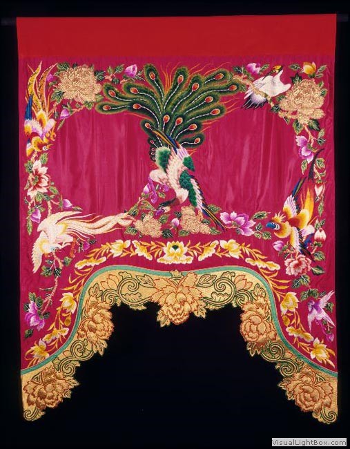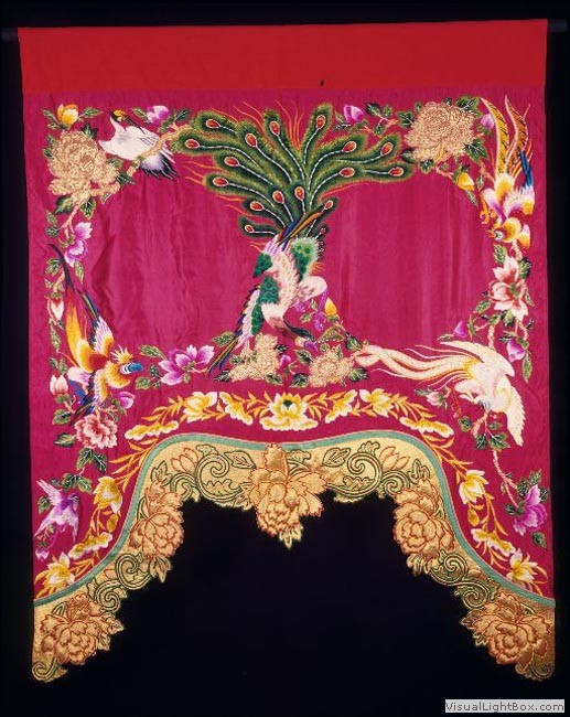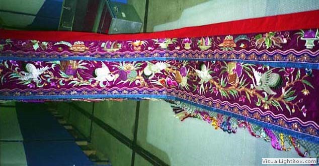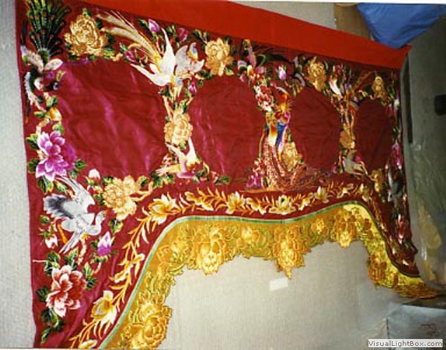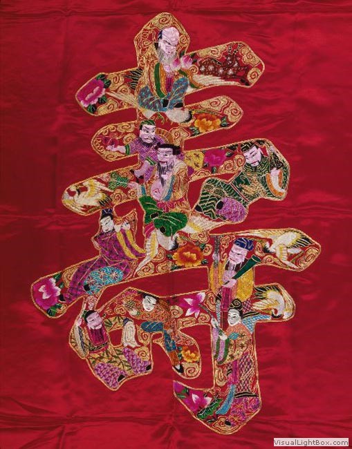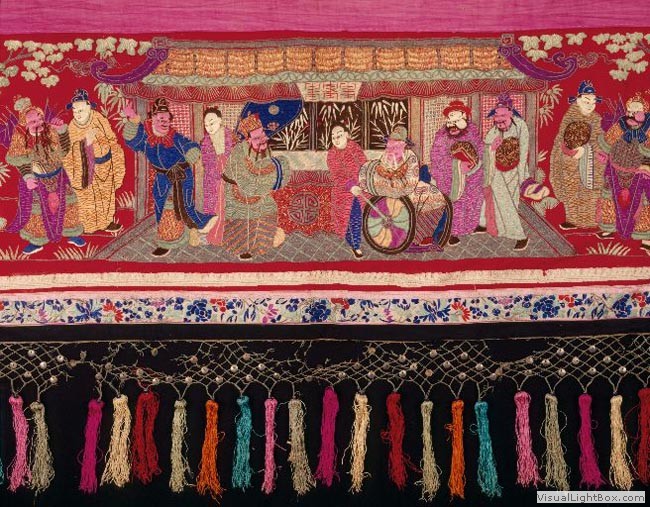 Whilst most temple embroideries were for general use, several pieces in the collection were for use at specific events. Funerals demanded the inclusion of blue. Others were to celebrate the birthday of elderly people and showing relatives and friends bringing their good wishes and gifts. Very special cloths were those used for the birthday of an old man, who had 5 generations of male descendents alive, including himself.