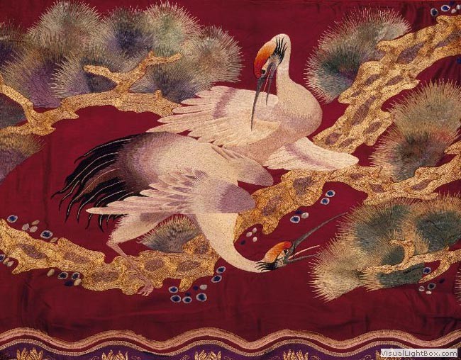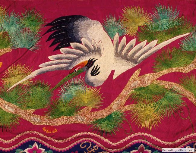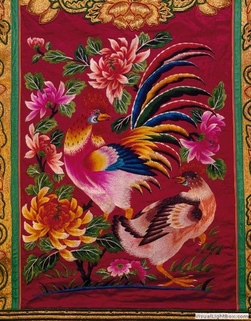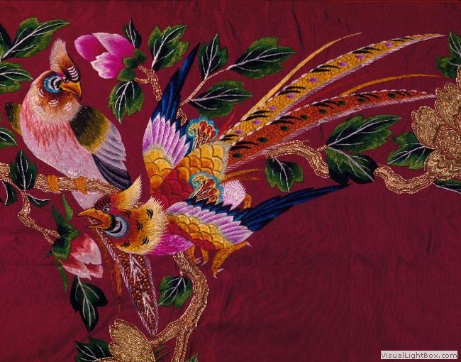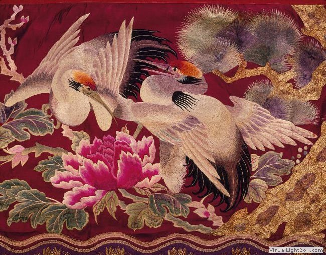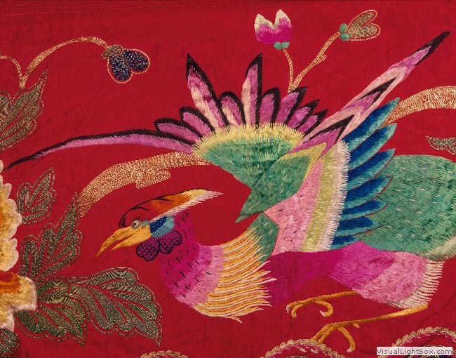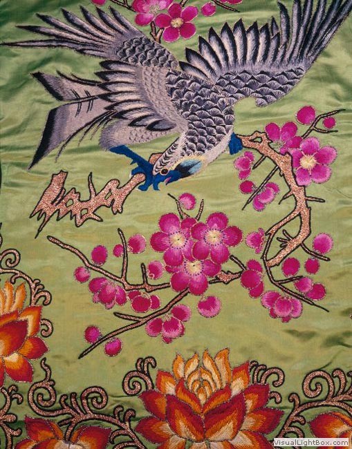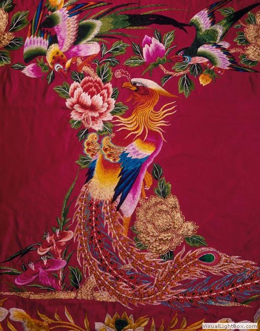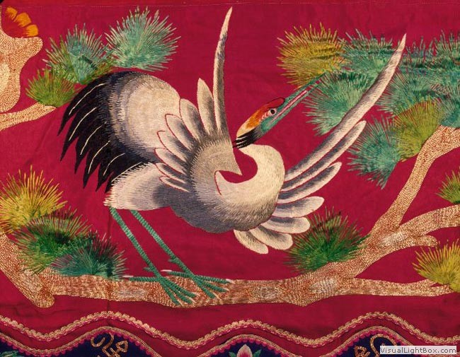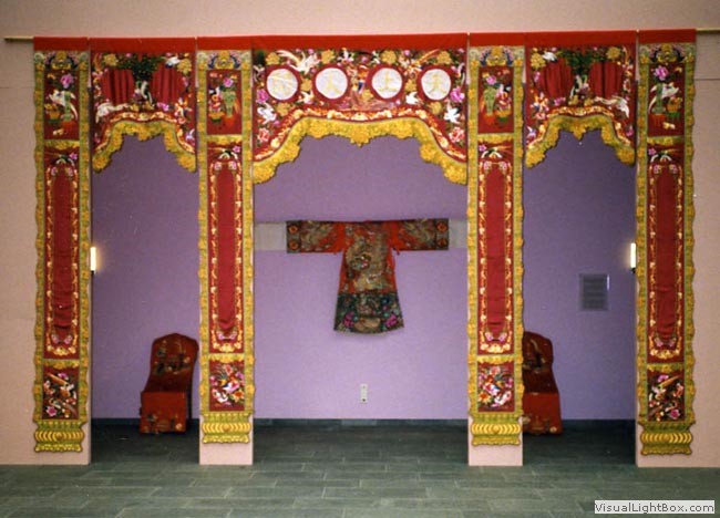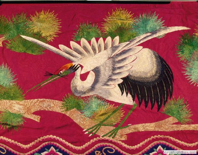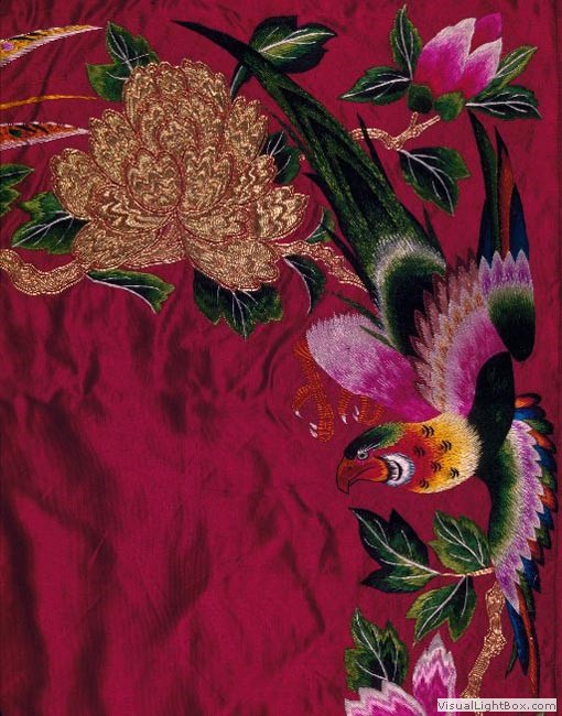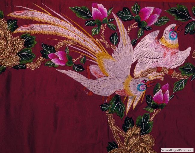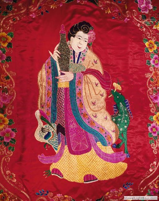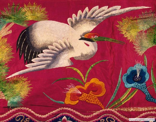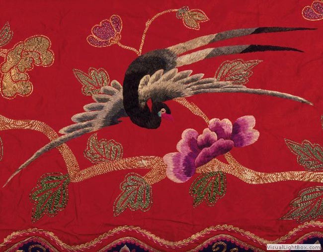 Whilst most temple embroideries were for general use, several pieces in the collection were for use at specific events. Funerals demanded the inclusion of blue. Others were to celebrate the birthday of elderly people and showing relatives and friends bringing their good wishes and gifts. Very special cloths were those used for the birthday of an old man, who had 5 generations of male descendents alive, including himself.