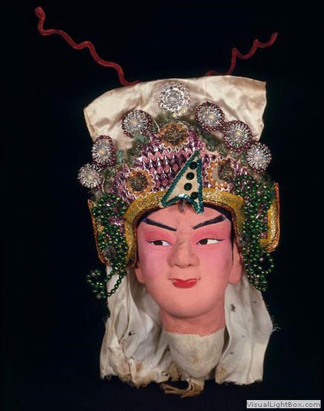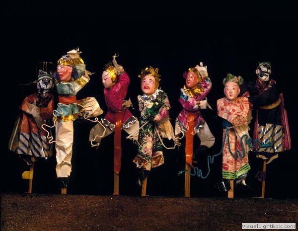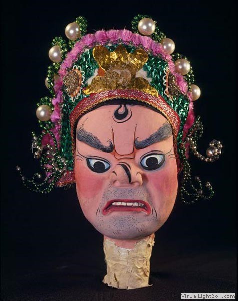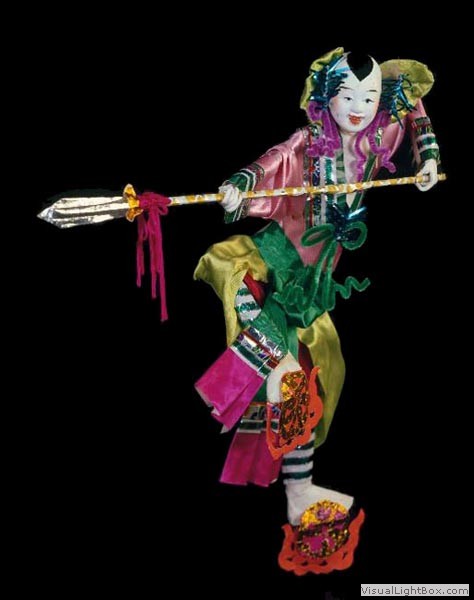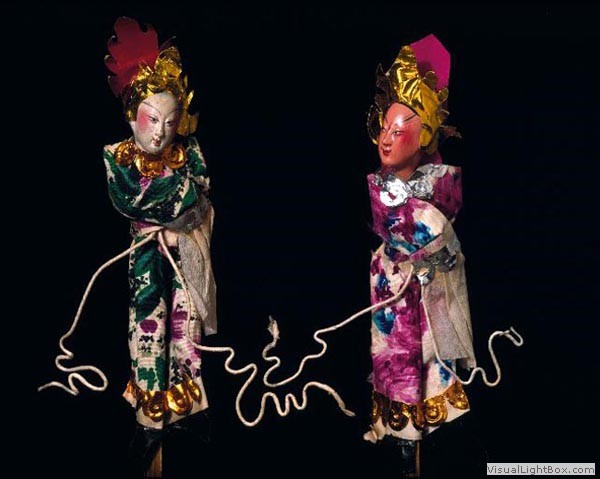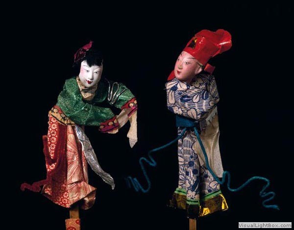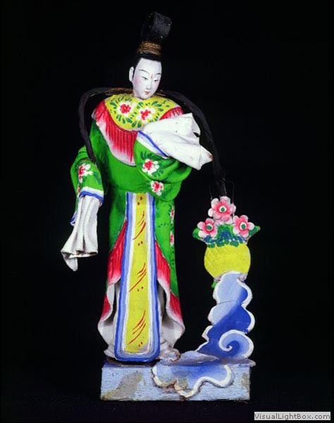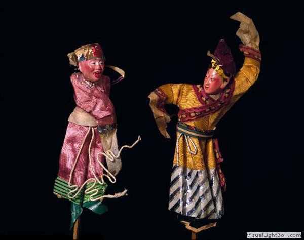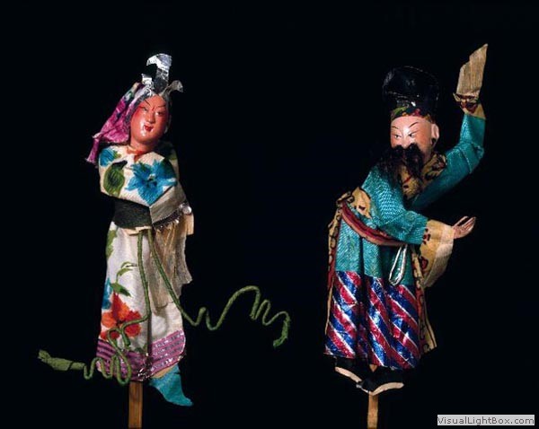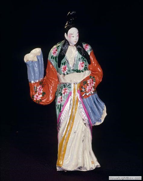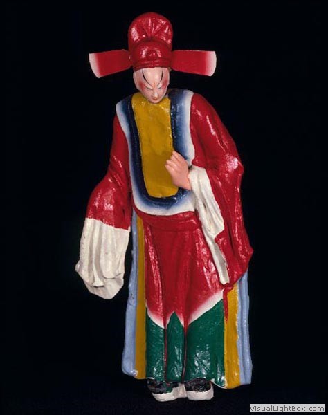 These small (c12cm) puppets were used in dioramas or as decorations on funerary and other occasions. They were placed on bamboo sticks for insertion in large joss sticks or other materials.